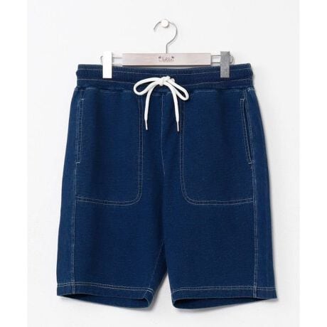 [型番:47U-6106-2025]デニム風裏毛とデニムの切り替えデザインが特徴のメンズハーフパンツ。後ろポケットのプリントがさりげないポイントに。トップスやジップパーカーとのセットアップコーデで統一感のあるスタイルが楽しめます。