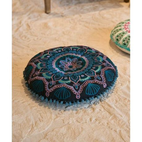 [型番:IMLP6101-2025]インドの伝統刺しゅうをたっぷり施したラウンドクッション。ソファやベッドに置くだけで、お部屋がぐっと華やかに。異国情緒漂うアクセントとしておすすめ。