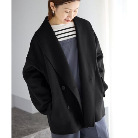 大きめなショールカラーが新鮮な印象のハーフコート。