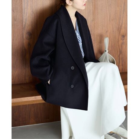 大きめなショールカラーが新鮮な印象のハーフコート。