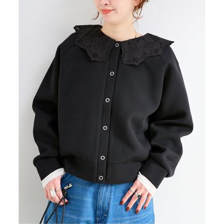 肉感があり一枚着として着用可能で、ニットが苦手な方にもおすすめしやすいです。シンプルな合わせやすい形で、配色にした裏側がチラッとアクセントに。リングドット釦をつけたので春先の羽織としてもお使いいただけます。コットン刺繍の取り外し可能の襟を付けて、フェミニンな装いも楽しめます。
