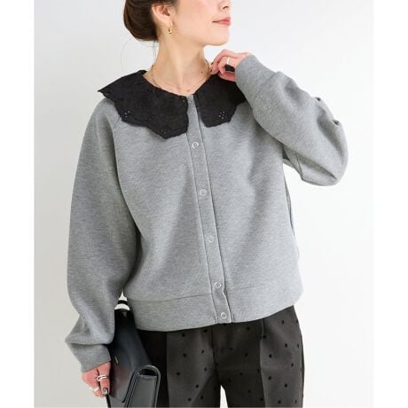 肉感があり一枚着として着用可能で、ニットが苦手な方にもおすすめしやすいです。シンプルな合わせやすい形で、配色にした裏側がチラッとアクセントに。リングドット釦をつけたので春先の羽織としてもお使いいただけます。コットン刺繍の取り外し可能の襟を付けて、フェミニンな装いも楽しめます。