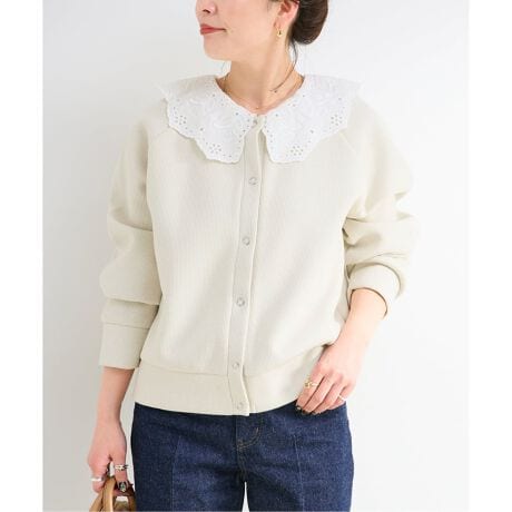 肉感があり一枚着として着用可能で、ニットが苦手な方にもおすすめしやすいです。シンプルな合わせやすい形で、配色にした裏側がチラッとアクセントに。リングドット釦をつけたので春先の羽織としてもお使いいただけます。コットン刺繍の取り外し可能の襟を付けて、フェミニンな装いも楽しめます。