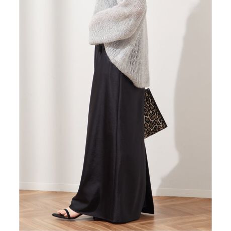 サテンの光沢感と落ち感で腰回りをすっきり見せてくれるマキシスカート。