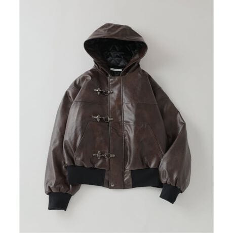 鈍く光沢を放つフェイクレザーを使用した、存在感のあるフーデッドジャケット。