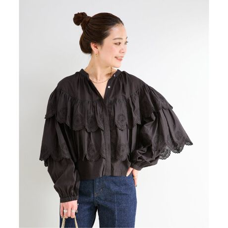 コットン素材にレース刺繍を施し雰囲気ある2段フリルにしたブラウスです。着丈は短めにしワイド感あるボトムスとの相性も良く、ボトムスにインして着るとフリルが華やかで着映えします。コットンの柔らかさも相まってビンテージライクに見えるのも特徴です。手洗い可能でご自宅でのイージーケアができるのも嬉しいポイントです!