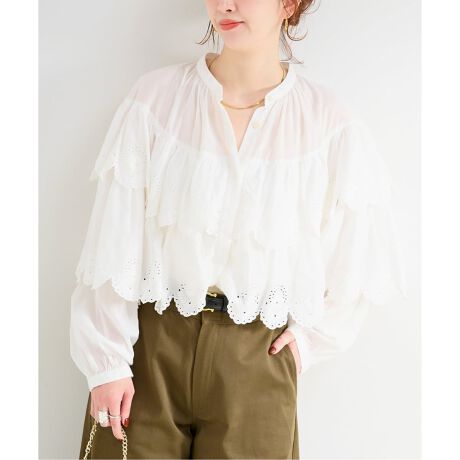 コットン素材にレース刺繍を施し雰囲気ある2段フリルにしたブラウスです。着丈は短めにしワイド感あるボトムスとの相性も良く、ボトムスにインして着るとフリルが華やかで着映えします。コットンの柔らかさも相まってビンテージライクに見えるのも特徴です。手洗い可能でご自宅でのイージーケアができるのも嬉しいポイントです!