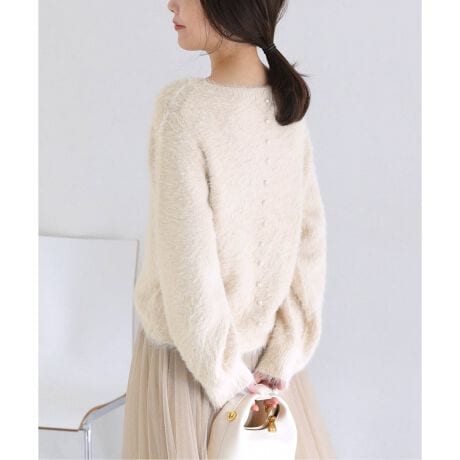 ふんわりとしたファーの素材感が女性らしさを引き立てる、バックパールデザインの長袖プルオーバー。