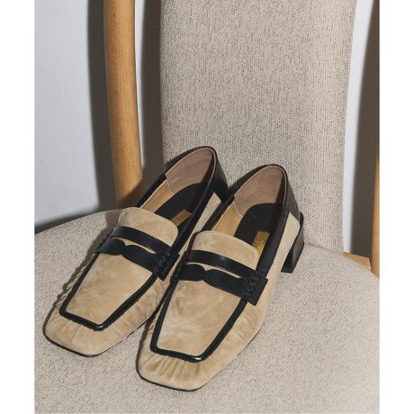 ワイドスクエアにギャザーディテールを組み合わせ、モードな中にも柔らかさを表現したローファー。