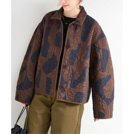 天然系素材をベースに表側はキャッチーな柄をプリントし、裏側は無地にして柄刺繍を施しました。裏側の刺繍が表にも反映されてクラフト感ある雰囲気になっています。襟付きで腰丈の合わせやすい形です。中綿を挟んでいるので春先までのライトアウターとして、他にはないオシャレを楽しみたい方にオススメのジャケットです。