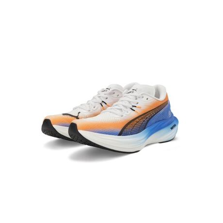 商品情報駅伝ランナーの「不安から自信へ」切り替えるスイッチを表現した EKIDEN PACK。その中でも「ウィメンズ ディヴィエイト ニトロ 3」は、PWRPLATEとNITROFOAMTMを搭載し、圧倒的な推進力と安定性を両立した万能モデルです。レースからペース走、ジョグまで幅広く対応し、ランナーの走りを次のレベルへ導きます。NITROFOAMTMは爆発的な速さを生み出す革新的フォームで、快適なクッション性を提供。さらに、PWRPLATEが着地の力を効率的に推進力へ変換し、エリート級の走行効率を実現します。アウトソールには耐久性とグリップ力に優れたPUMAGRIPを採用し、あらゆる路面で安定した走りをサポート。アッパーには通気性を考慮したエンジニアードメッシュを使用し、PWRTAPEで補強することでしっかりとしたフィット感を確保。さらに、フォームで補強されたロールカラー構造が快適さとホールド感を高めます。特徴・NITROFOAMELITE:トップレーシングモデルと同じ、高い反発性を提供するNITROELITEFOAM・NITROFOAM:爆発的な速さを提供する革新的なテクノロジー。NITROELITEFOAMと比較すると、安定性があり、脚への負担を軽減・PWRPLATE:パワフルな推進力とエリート級の効率性を実現・PUMAGRIP:PUMAGRIPアウトソールは耐久性のあるラバー製で、高いグリップ力を提供・エンジニアードメッシュアッパー:通気性を考慮して設計され、PWRTAPEで補強されたプレミアム素材が足へ快適なフィットを提供・ロールカラー:フォームで補強されたロールカラー構造により、快適さとフィット感を実現詳細・重量:約265g(27cm)・エンジニアードメッシュアッパー・かかと-つま先の高低差(ドロップ):10mm・プロネーションタイプ:ニュートラル・シリアス/ファンランナー向け・普段のランニングからマラソンまで対応・耐久距離目安:800km