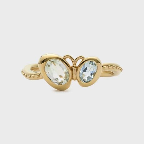 私だけが知っている、秘密の庭。目をとじると心の奥に浮かぶ、花も風も空もふわりと混ざり合う、懐かしく心地よい景色。秘密の庭に迷い込んで優雅に舞う蝶の羽根に見立てたのは、グリーンクオーツとアクアマリン。羽ばたくような角度にもこだわってセッティングしました。覆輪留めによる爪の引っ掛かりがない仕上げは、滑らかな着け心地も魅力。蝶が花々の間をひらひらと舞う軌跡を描くようなアームの曲線が、手元を美しく印象付けます。※天然石や天然素材を使用しているものは、サイズ・色味・風合いの違いや、若干の傷、内包物の有無などに個体差があります。予めご了承ください。※サイズ直し不可。