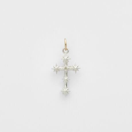 クロス(十字架)は古くから“守護”“生命力”“永遠”を象徴し、宗教的なシンボルであると同時に、人々に神秘の力を与えるお守りとして親しまれてきました。このクロスモチーフを、希望や夢、ポジティブなエネルギーを象徴する星のデザインで表現しています。中央には、古代より魔除けやお守りとされてきたダイヤモンドをあしらいました。軽やかな印象で身に着けられながら、強い意味を宿した特別なチャームです。※天然石や天然素材を使用しているものは、サイズ・色味・風合いの違いや、若干の傷、内包物の有無などに個体差があります。予めご了承ください。