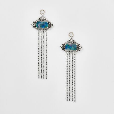 隙間なく敷き詰められたオパールの欠片が、まるで夢の景色を描いた絵画のような印象の美しいモザイクオパール。そんなモザイクオパールをシャープなスクエアシェイプにカットし、リーフと実をかたどった装飾で縁取っています。縁取りの古美仕上げのシルバーにパイライトを添えることで、アンティーク感のある仕上がりになっています。存在感のあるボリュームで、揺れるチェーンがエキゾチックな雰囲気を演出します。※天然石や天然素材を使用しているものは、サイズ・色味・風合いの違いや、若干の傷、内包物の有無などに個体差があります。予めご了承ください。※オパールは大変柔らかく乾燥に弱い為、取り扱いにはご注意下さい。※石材は爪留め(糊を併用)していますので水分にご注意下さい。※古美加工は個体差があります。※モザイクオパールの底面は黒色樹脂状接着剤と天然岩石系(着色あり)です。