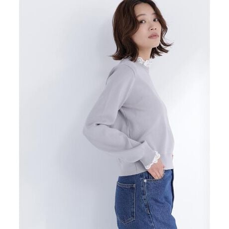襟ぐりと袖口にレース素材のフリルをドッキングしたニットプルオーバー。1枚着るだけで様になり、レースブラウスをレイヤードしているようなデザインがポイントです。フェミニンな印象のレースデザインが華やかさをプラス。身頃はすっきりとした総針編みにしており、普段着からオフィスシーンまで幅広く着回せます。<素材>身頃のニットはキレイな目面の糸を使用し、総針編みですっきりと編み立てています。襟ぐりと袖口はレース素材をドッキングしています。<詳細>仕様・後ろボタン裏地・なし透け感・なし / 光沢・なし / 伸縮性・あり 生地の厚さ・普通※モデルの着用画像の場合、光の当たり具合により、実際の色味と異なって見えることがございます。色味は、商品単体の画像をご参照ください。