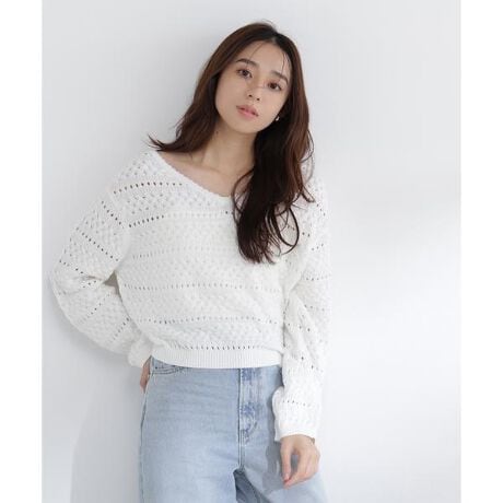 春らしい雰囲気を叶えてくれる透かし編みニット。ネックラインを広く取っているので、女性らしいシルエットを演出します。Vネックのリブにもさり気ない編地の変化をつけてポイントに。ざっくりとしたサイズ感なので、パンツや軽やかなスカートと合わせるのがおすすめ。デニムONデニムコーデに羽織ったレイヤードスタイルも、春気分を盛り上げてくれます。<素材>春らしい綿タッチの透かし編みニットです。<詳細>仕様・開閉なし裏地・なし透け感・なし / 光沢・なし / 伸縮性・あり生地の厚さ・普通※モデルの着用画像の場合、光の当たり具合により、実際の色味と異なって見えることがございます。色味は、商品単体の画像をご参照ください。