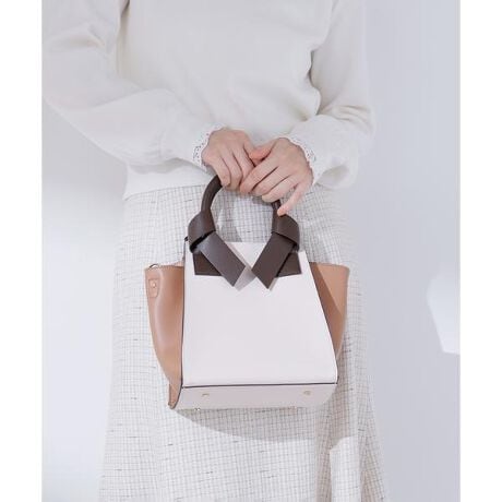 マチが張り出したトラペーズ型のボディにハンドルリボン、シーズン毎に取り入れやすい配色がポイントの定番人気トートバッグ。幅広マチで、通勤など荷物が多めの時にも丁度良い容量感です。マチを内側に折り込んでナスカンで留めれば、細長くシャープなシルエットに。長さ調節可能なショルダーストラップもついて実用性もあります。内装についた2つのオープンポケットも嬉しいポイント。ハンドルのリボンをスタッズ留めして緩まないように仕上げています。<素材>黒とオフベースカラーはつるっとした表革風のフェイクレザーを使用。ベースベースカラーの本体にはスウェードタッチのフェイクレザー/ハンドルには表側風のフェイクレザーを使用しています。※モデルの着用画像の場合、光の当たり具合により、実際の色味と異なって見えることがございます。色味は、商品単体の画像をご参照ください。