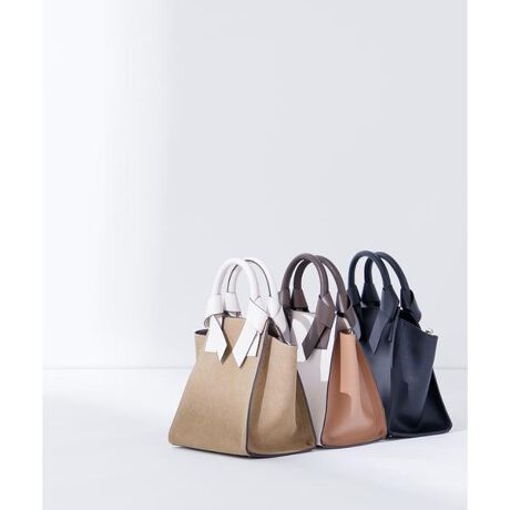 マチが張り出したトラペーズ型のボディにハンドルリボン、シーズン毎に取り入れやすい配色がポイントの定番人気トートバッグ。幅広マチで、通勤など荷物が多めの時にも丁度良い容量感です。マチを内側に折り込んでナスカンで留めれば、細長くシャープなシルエットに。長さ調節可能なショルダーストラップもついて実用性もあります。内装についた2つのオープンポケットも嬉しいポイント。ハンドルのリボンをスタッズ留めして緩まないように仕上げています。<素材>黒とオフベースカラーはつるっとした表革風のフェイクレザーを使用。ベースベースカラーの本体にはスウェードタッチのフェイクレザー/ハンドルには表側風のフェイクレザーを使用しています。※モデルの着用画像の場合、光の当たり具合により、実際の色味と異なって見えることがございます。色味は、商品単体の画像をご参照ください。