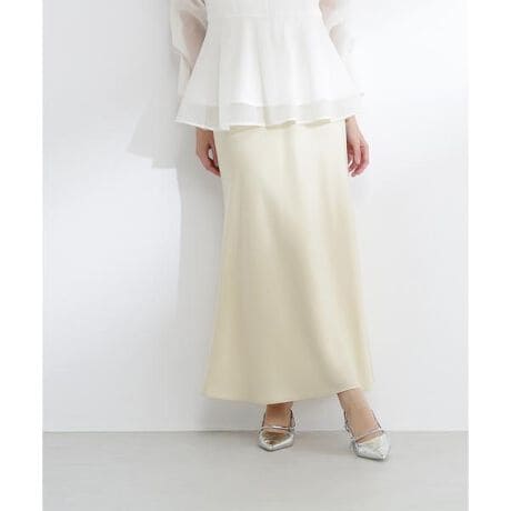 ほどよい光沢のあるサテン素材をバイアス取りにし、体に沿うようなしなやかなラインを表現したナロースカート。動きに合わせて揺れる、落ち感のあるシルエットが女性らしい印象に見せてくれます。ウエストまわりはすっきり見える設計で、トップスインもアウトもバランス良く決まるデザインです。<素材>肉厚で上品なサテン素材を使用しています。<詳細>仕様・左ファスナー裏地・あり透け感・なし / 光沢・あり / 伸縮性・なし 生地の厚さ・普通※モデルの着用画像の場合、光の当たり具合により、実際の色味と異なって見えることがございます。色味は、商品単体の画像をご参照ください。