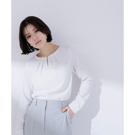 襟元のタックデザインが上品な印象のブラウス。さり気ないスリットとライトゴールドカラーのホックがアクセントになっています。スカートもパンツも合わせやすく、ジャケットインも決まるのでオフィスシーンにおすすめです。<素材>柔らかいフルダルジョーゼットの合繊素材を使用。オフカラーでも透けにくい素材感です。<詳細>仕様・前ホック裏地・なし透け感・なし / 光沢・なし / 伸縮性・ややあり生地の厚さ・普通※モデルの着用画像の場合、光の当たり具合により、実際の色味と異なって見えることがございます。色味は、商品単体の画像をご参照ください。