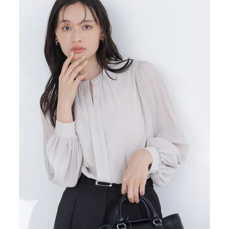 軽やかな楊柳生地に上品な光沢のメタルポイントを首元に添えた華やかなブラウス。袖のプリーツが動くたびに美しく揺れ、腕まわりをエレガントに演出してくれます。縦シボのある素材は体のラインをすっきり見せながらも、程よい透け感で大人の抜け感をプラス。スカートでもパンツでも相性がよく、着まわし力は抜群です。<素材>軽く柔らかい風合いの楊柳素材を使用。袖にはクリスタルプリーツ加工を施しています。<詳細>仕様・前ホック裏地・あり透け感・ややあり / 光沢・なし / 伸縮性・なし 生地の厚さ・普通※モデルの着用画像の場合、光の当たり具合により、実際の色味と異なって見えることがございます。色味は、商品単体の画像をご参照ください。