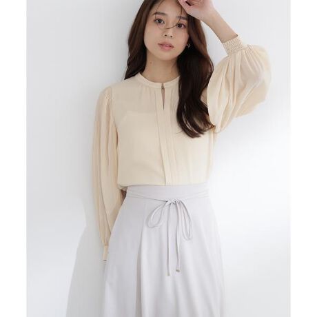 軽やかな楊柳生地に上品な光沢のメタルポイントを首元に添えた華やかなブラウス。袖のプリーツが動くたびに美しく揺れ、腕まわりをエレガントに演出してくれます。縦シボのある素材は体のラインをすっきり見せながらも、程よい透け感で大人の抜け感をプラス。スカートでもパンツでも相性がよく、着まわし力は抜群です。<素材>軽く柔らかい風合いの楊柳素材を使用。袖にはクリスタルプリーツ加工を施しています。<詳細>仕様・前ホック裏地・あり透け感・ややあり / 光沢・なし / 伸縮性・なし 生地の厚さ・普通※モデルの着用画像の場合、光の当たり具合により、実際の色味と異なって見えることがございます。色味は、商品単体の画像をご参照ください。