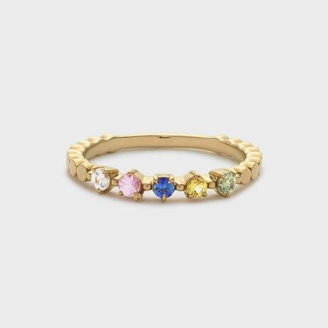 瞼の裏に浮かぶのは、何気ない日常の1ページ。手を広げて友達に呼びかける姿。毎日少しずつ訪れる発見にワクワクしたあの時間。ひっそりと忍ばせていた淡い恋心。そんな記憶の欠片からインスパイアされたノスタルジックなピンキーリング。色とりどりのサファイアを支える爪にひとつだけ隠された小さな小さなハートは、自分だけが知っている秘密のモチーフ。ときめくような色合いで、手元を彩ります。※天然石や天然素材を使用しているものは、サイズ・色味・風合いの違いや、若干の傷、内包物の有無などに個体差があります。予めご了承ください。※サイズ直し不可。