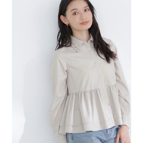 襟にフリルをあしらった華やかなペプラムシルエットのブラウス。しなやかな素材感で、上品な印象に仕上げています。一枚着はもちろん、ニットカーディガンやショートジャケットとのレイヤードにもおすすめ。フェミニンさとキレイめな印象を両立した、着回し力の高い一枚です。<素材>しなやかなシャツ素材を使用。シワになりにくい素材です。<詳細>仕様・前ボタン裏地・なし透け感・なし / 光沢・なし / 伸縮性・なし 生地の厚さ・普通※モデルの着用画像の場合、光の当たり具合により、実際の色味と異なって見えることがございます。色味は、商品単体の画像をご参照ください。