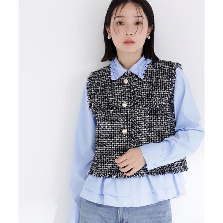 程よくコンパクトなシルエットが上品さとスタイリッシュさを兼ね備えたツイードコンパクトジレ。ジャストサイズなのでレイヤードがしやすく、ブラウスやニットの上から羽織るだけで、日常からオケージョンまで幅広く活躍する万能アイテムです。フレアスカートやワイドパンツと合わせることで、メリハリのあるフェミニンコーディネートが完成します。<素材>ほどよいカジュアル感のあるツイード生地を使用。<詳細>仕様・前ボタン裏地・あり透け感・なし / 光沢・なし / 伸縮性・なし生地の厚さ・普通<シリーズ>■ジレ[品番:0176155160] ※モデルの着用画像の場合、光の当たり具合により、実際の色味と異なって見えることがございます。色味は、商品単体の画像をご参照ください。