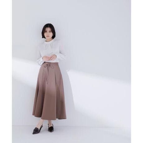 上品な揺れ感とすっきりとしたシルエットが魅力のフレアスカート。ウエストにあしらった細めのナローリボンが控えめなアクセントとなり、華やかになりすぎず大人の女性らしさを演出。程よく広がるフレアラインは脚をきれいに見せてくれるので、オフィスでも端正なスタイルを叶えます。キレイめブラウスやニットとも相性が良く、通勤から上品なデイリースタイルまで幅広く活躍してくれます。<素材>シワになりにくい軽やかなポリエステル素材を使用しています。<詳細>仕様・後ろファスナー裏地・あり透け感・なし / 光沢・なし / 伸縮性・なし 生地の厚さ・普通※モデルの着用画像の場合、光の当たり具合により、実際の色味と異なって見えることがございます。色味は、商品単体の画像をご参照ください。