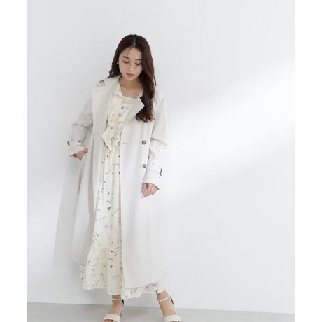 とろみ感のある素材を使用した春にぴったりなトレンチコート。裏地がない軽やかな仕上がりなので長く着ていただけます。ボタンを上まで留めるとステンカラーとしても着られる2wayデザイン。袖口のベルトはお好みで絞れる仕様。共地ベルトでウエストマークすると、ウエストを細く見せてくれます。<素材>ポリエステル100%でありながら特殊加工によりレーヨンのようなふくらみ・ソフトさを兼ね備えています。パウダリーなタッチです。この商品は雨・水滴をはじき易い加工を施しておりますが、完全防水ではなく、効果は永久的なものではございません。<詳細>仕様・前ボタン裏地・なし透け感・なし / 光沢・なし / 伸縮性・なし生地の厚さ・普通※モデルの着用画像の場合、光の当たり具合により、実際の色味と異なって見えることがございます。色味は、商品単体の画像をご参照ください。