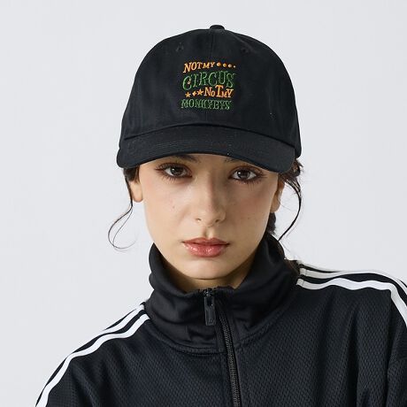 NOT MY CIRCUS NOT MY MONKEYS(わたしには関係ないよ)のロゴをフロントに刺繍し、バッグにはそんな表情をしたサルの刺繍をしたキャップです。