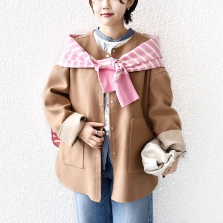 ノーカラーのショートコート。