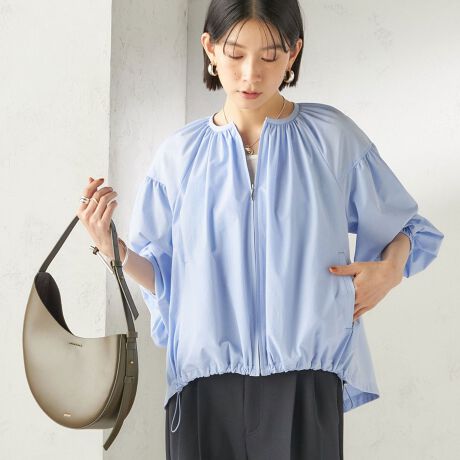 機能性素材を使用した、軽やかなギャザーデザインの羽織ブルゾン