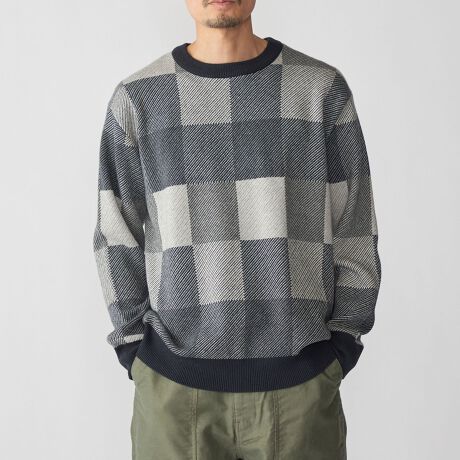 カシミヤブレンドの上品なチェック柄クルーネックニット
