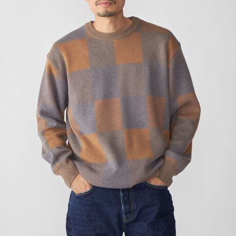 カシミヤブレンドの上品なチェック柄クルーネックニット