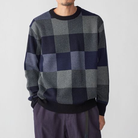 カシミヤブレンドの上品なチェック柄クルーネックニット