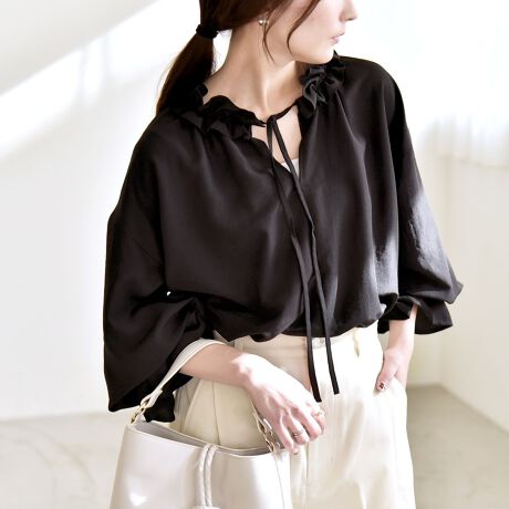 フリル襟で顔周りが華やぐ、着映えブラウス。