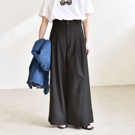 ウエストのボタンディテールがモードな雰囲気のある、ハイウエストのワイドパンツ。