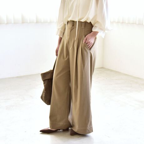 太めのベルト部分とフロントに施した深めの2タックで、腰周りや太ももにゆとりを持たせながらすっきりとした縦ラインを演出し、スタイルアップ効果も◎