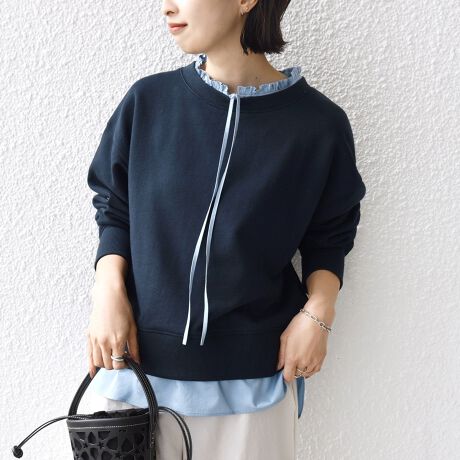 すっきり着こなせるレイヤード風デザインのプルオーバー