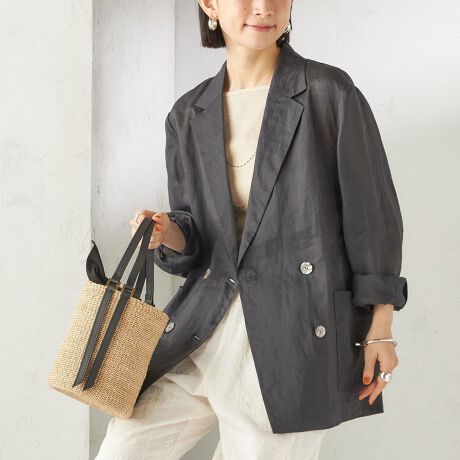 夏の羽織として活躍する、シアー素材のダブルブレストジャケット。