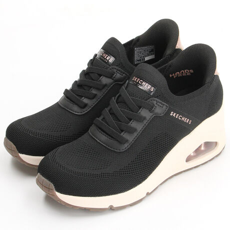 履き心地がさらに向上したSkechers StreetTM Hands Free Slip-ins(R)(スケッチャーズ ストリート ハンズフリー スリップインズ):ウノ ウェッジ - スリップ N ニットで、足元からワードローブをアップデート。Heel PillowTM(ヒールピロー)デザインを採用し、Stretch FitTM(ストレッチフィット)エンジニアードニットのアッパーにメタリックの人工皮革の縁取りを施したファッションスニーカー。Skechers Air-Cooled Memory FoamTM(スケッチャーズ エアクールドメモリーフォーム)インソール、ビジブル構造のSkech-Air(R)(スケッチエア)エアクッションミッドソールを備えたプラットフォームウェッジを搭載しています。