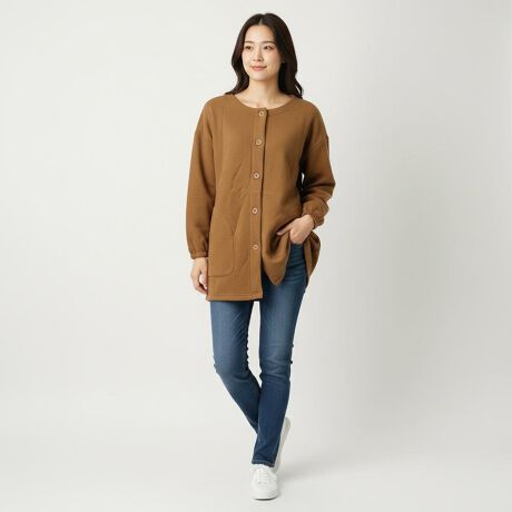 【裏起毛であったかかっぽう着】カジュアルデザインで普段着感覚、裏起毛であったかいかっぽう着【前開きで着脱楽々】大きめボタンで大きく開くから、サッと羽織れて脱ぎやすく、忙しい朝もスムーズな使いやすさ◎【裏起毛であたたか】裏起毛素材でふんわりあたたかく、冬場の家事や保育の仕事でも冷えから守ってくれる快適さ!【両サイドにポケット】左右にポケットが付いて、スマホやティッシュなどをサッと入れられる実用的な便利さ〇【袖口ゴムで安心】袖口がゴム仕様で手首にフィットし、作業中も袖がまくれ上がらず動きやすい機能性♪【厚手なのに軽い】厚手生地でしっかり防寒できるのに軽量だから、一日中着ていても疲れにくい快適な着心地。