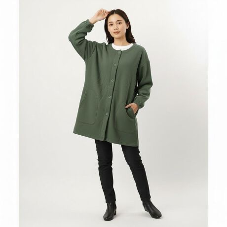 【裏起毛であったかかっぽう着】カジュアルデザインで普段着感覚、裏起毛であったかいかっぽう着【前開きで着脱楽々】大きめボタンで大きく開くから、サッと羽織れて脱ぎやすく、忙しい朝もスムーズな使いやすさ◎【裏起毛であたたか】裏起毛素材でふんわりあたたかく、冬場の家事や保育の仕事でも冷えから守ってくれる快適さ!【両サイドにポケット】左右にポケットが付いて、スマホやティッシュなどをサッと入れられる実用的な便利さ〇【袖口ゴムで安心】袖口がゴム仕様で手首にフィットし、作業中も袖がまくれ上がらず動きやすい機能性♪【厚手なのに軽い】厚手生地でしっかり防寒できるのに軽量だから、一日中着ていても疲れにくい快適な着心地。