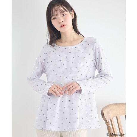 ミッフィーの世界観を感じるやさしい小柄プリントが散りばめられた長袖トップスです。胸元の切り替えから下がふんわり広がるシルエットで、腰まわりをさりげなくカバーしてバランス良く見せます。ワッフル調の素材感は柔らかな肌触りで着心地がよく、リラックスタイムにもお出かけにも使いやすいのが魅力です。落ち着いた配色と控えめなイラストで大人可愛い雰囲気に仕上がります。