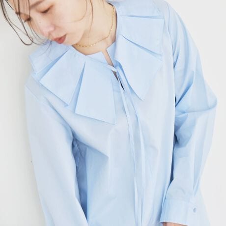 フリルのようなボックスプリーツの襟が存在感のあるデザインシャツ。