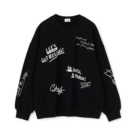 手書き風のロゴをちりばめた個性あふれるグラフィックのプルオーバーです。