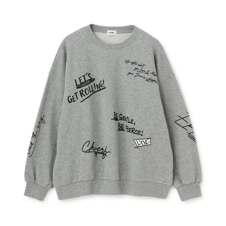 手書き風のロゴをちりばめた個性あふれるグラフィックのプルオーバーです。