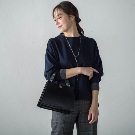 ネックは詰まりすぎないクルーネックで、顔まわりをすっきりと見せつつ上品な印象に。